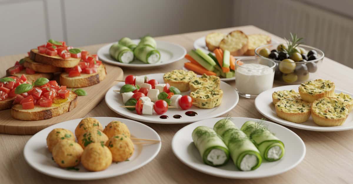 Algumas opções deliciosas incluem bruschettas variadas, mini quiches, espetinhos de frutas e patês com torradas.